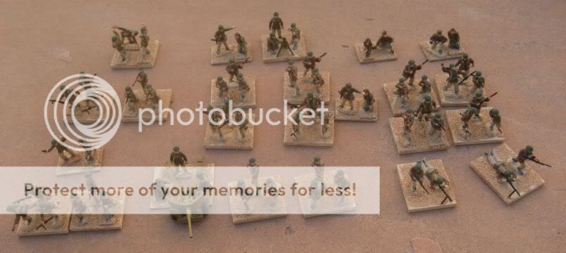 A reduced-strength battalion with command stand and two companies each of an infantry command stand and infantry stand. Officer is ESCI; radioman is Airfix.